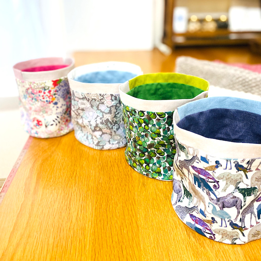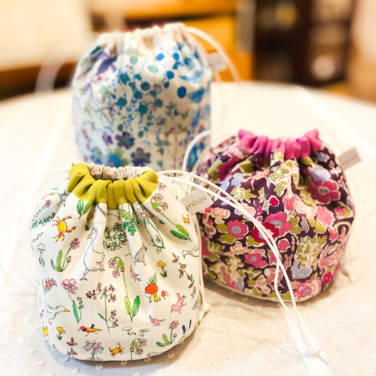 そして11/3からこちらの4種を追加納品させていただきました。手前から、キュー・フォー・ザ・ズー、ウィンターベリー、ウッドランド・ベッツィ(グレー系)、パッチワークストーリーズ。まるっころ巾着は内布のお色も可愛いので、制作過程で写真を撮ってみました。手に取って見ていただけることがありましたら、内布もぜひチェックしてみていただきたいです。