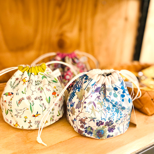 一つ前の投稿でご紹介させていただいた三角鍋つかみの他に、 “Life style shop さんかく” さんには「まるっころ巾着」も置いていただいています。