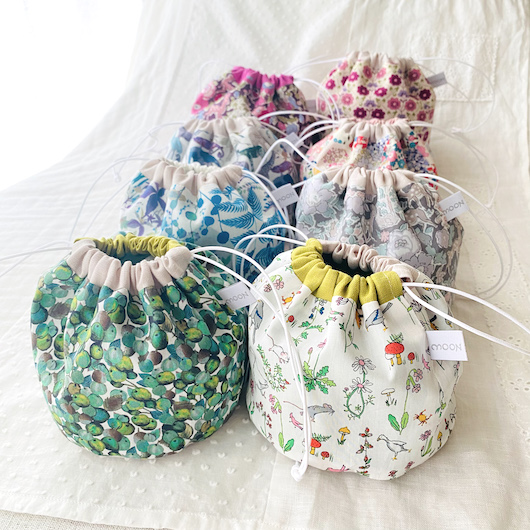 そして11/3からこちらの4種を追加納品させていただきました。手前から、キュー・フォー・ザ・ズー、ウィンターベリー、ウッドランド・ベッツィ(グレー系)、パッチワークストーリーズ。まるっころ巾着は内布のお色も可愛いので、制作過程で写真を撮ってみました。手に取って見ていただけることがありましたら、内布もぜひチェックしてみていただきたいです。
