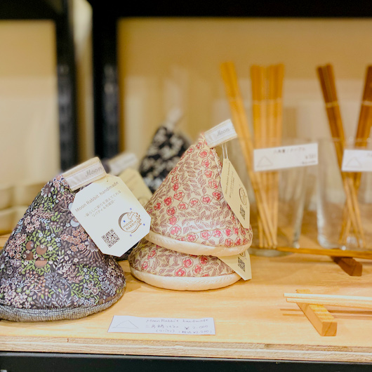 “さんかく” さんには ”まるっころ巾着” も置いていただいています。店内の様子は、次回ご紹介する ”まるっころ巾着” の投稿にも載せさせていただきたいと思います。